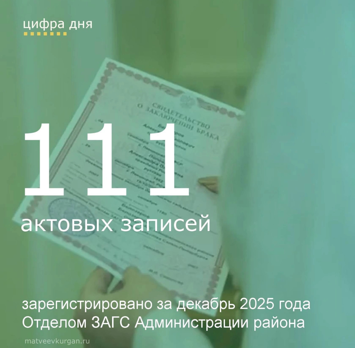 В декабре 2025 года отделом ЗАГС Администрации Матвеево-Курганского района зарегистрировано 111 актовых записей, что на 5 больше, чем за аналогичный период 2024 года. В том числе: