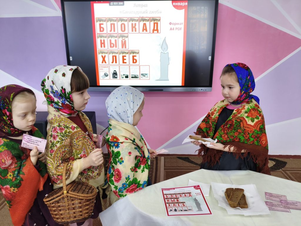Воспитателем с детьми была проведена беседа о жизни жителей осажденного города, показана презентация, из которой узнали: о «блокадной ласточке», о «дороге жизни», о «блокадном хлебе». Обсудили, как тяжело доставался кусок хлеба людям на фронте, в глубоком тылу, в блокадном Ленинграде. Показывая детям, кусочек хлеба весом 125 грамм, обратили их внимание, что эта норма выдавалась по карточкам на один день, и что блокадный хлеб был испечён не только из съедобной муки, а также из опилок и жмыха.