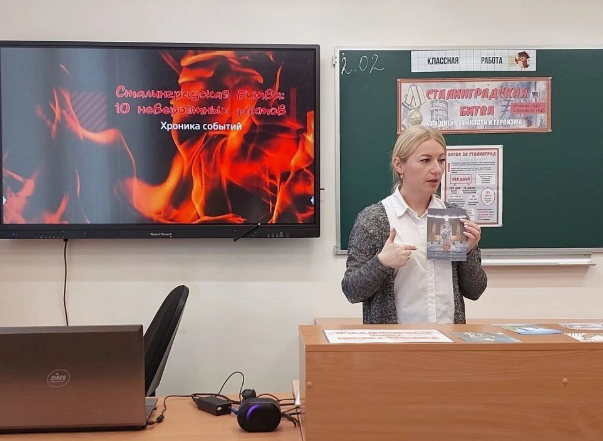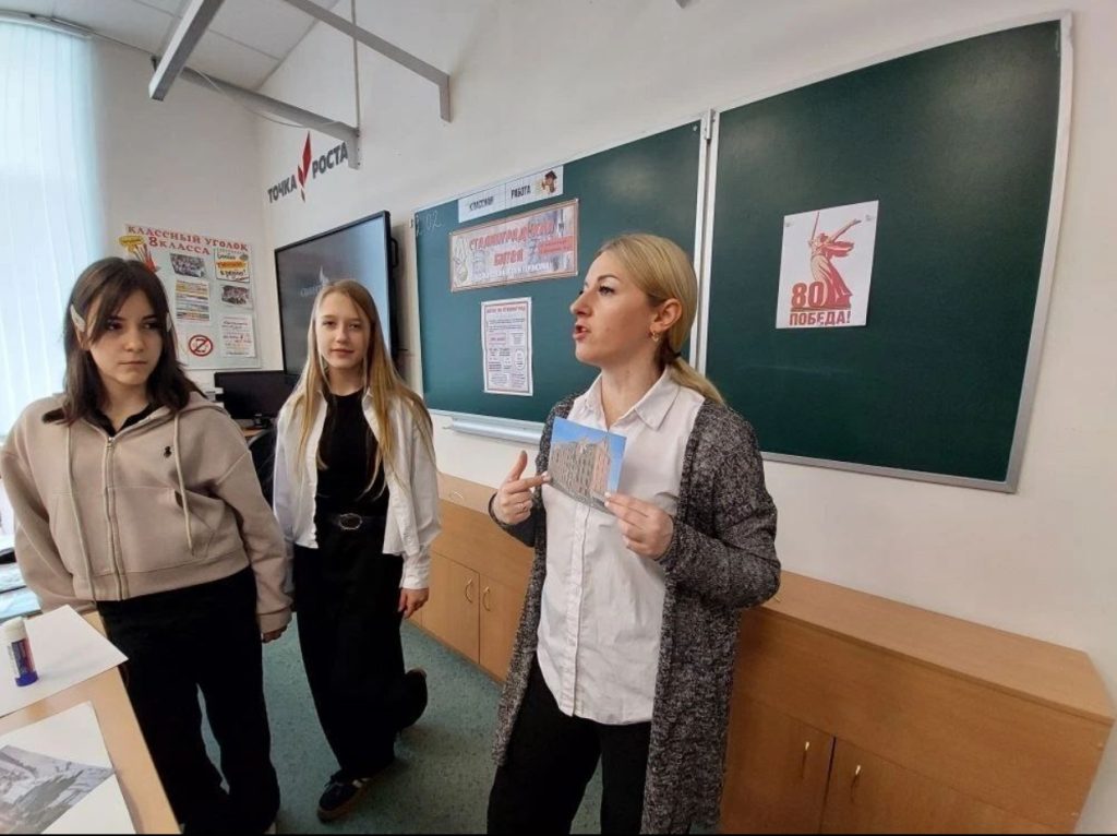 Так, 2 февраля советник директора по воспитанию Асадчая Е.Ю. организовала интерактивный урок «Сталинград: 200 дней и мужества» для семиклассников. В рамках мероприятия участники изучили поэтапно историю величайшей битвы, слушали аудиофрагметы и смотрели документальный видеоролик о 10 самых известных фактах Сталинградской битвы. По итогам мероприятия ребята совместно с Екатериной Юрьевной провели коллективно-творческое дело по созданию аппликации «Город-герой», в рамках которой участники смогли собрать коллективную композицию с символами битвы (фонтан, огонь, дом Павлова, Родина- мать ит.д). Ребята сделали вывод о том, что город стал символом массового героизма, мужества, стойкости и самопожертвования. Ни одно крупное сражение Второй мировой войны не начиналось так неблагоприятно