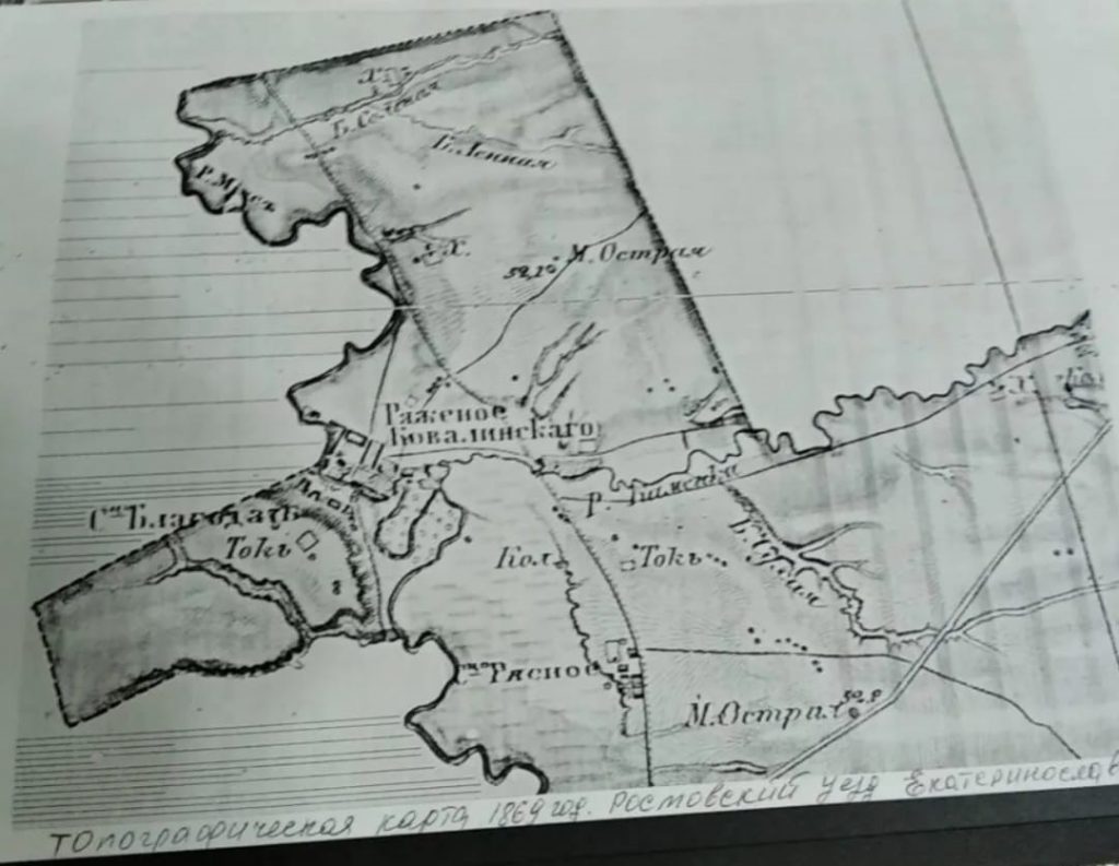 Согласно «Военно-Топографической картеЕкатеринославской губернии» за 1869 год, юго-западная граница между Ростовским уездом и Миусским округом проходила по балке «Соленой», чуть выше нынешнего Колесниковского пруда.