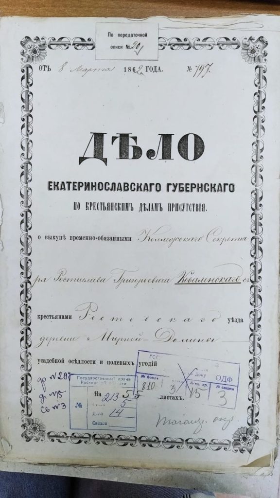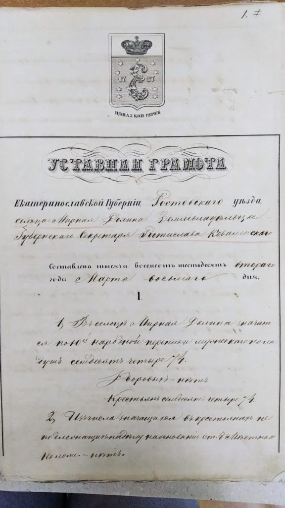 Марта 1862 года была составлена купчая, и «Уставная грамота», между крестьянами сельца «Мирная Долина» и помещиком Р.Г. Ковалинским.