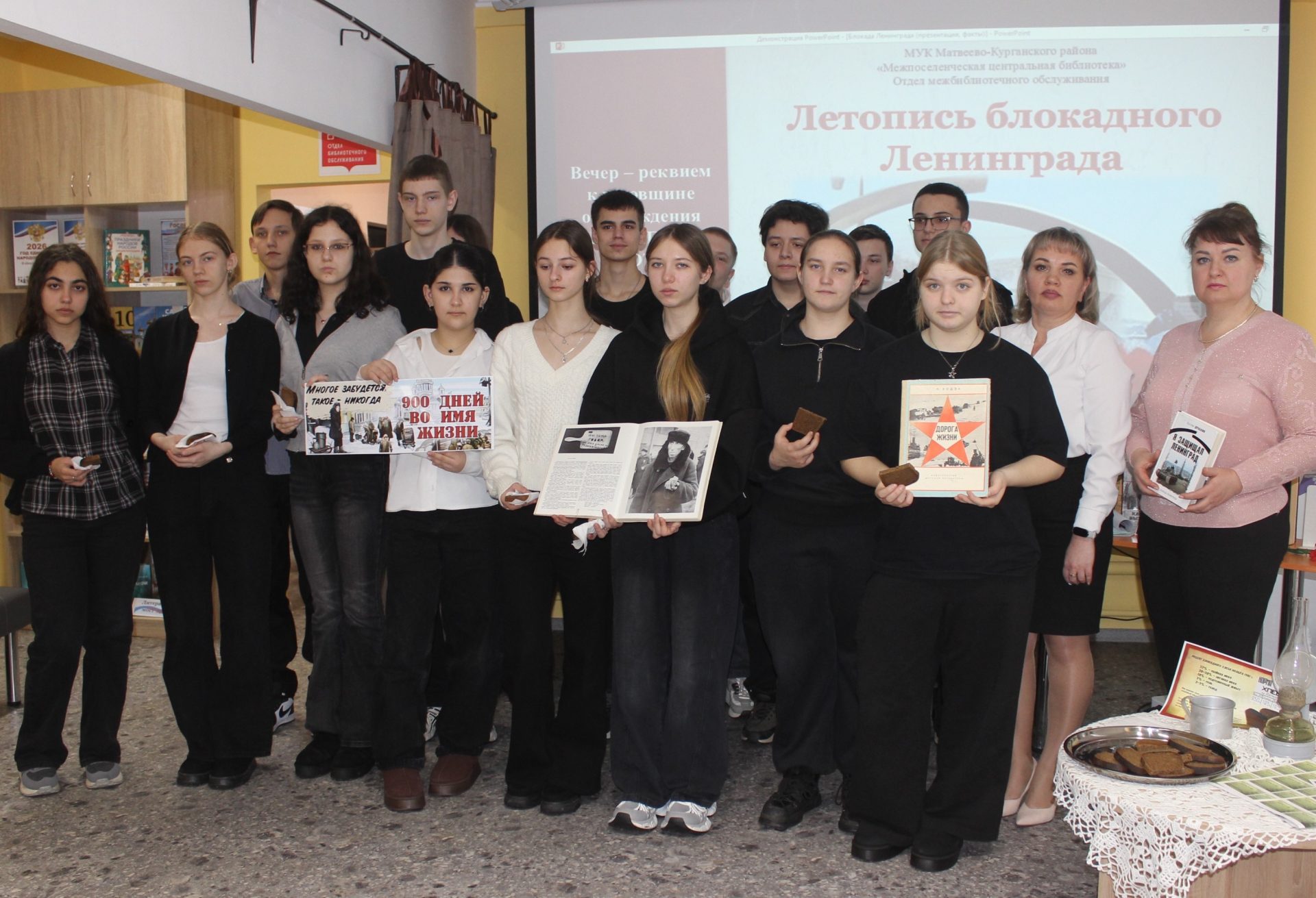 В Центральной библиотеке поселка Матвеев Курган для учащихся старших классов МБОУ Матвеево-Курганской СОШ № 1 состоялся вечер-реквием «Летопись блокадного Ленинграда». Мероприятие было посвящено памяти героических событий и тяжелых испытаний, которые пережил город в годы Великой Отечественной войны.