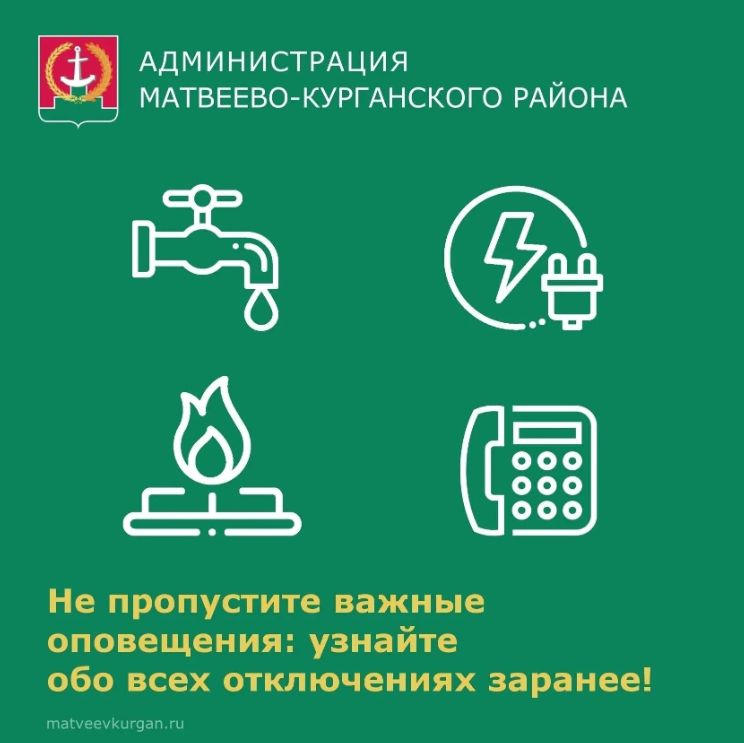 Уважаемые жители Матвеево-Курганского района! Напоминаем вам о специальном Telegram-канале, где оперативно публикуются уведомления о предстоящих плановых и аварийных отключениях электричества, воды и газа, а также ремонтах инженерных сетей.