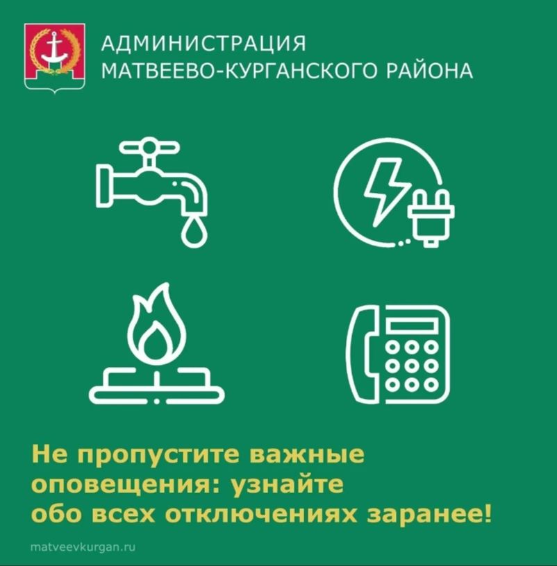 Уважаемые жители Матвеево-Курганского района! Напоминаем вам о специальном Telegram-канале, где оперативно публикуются уведомления о предстоящих плановых и аварийных отключениях электричества, воды и газа, а также ремонтах инженерных сетей.