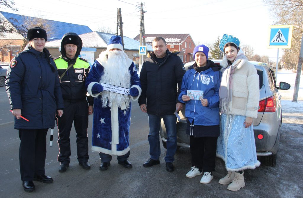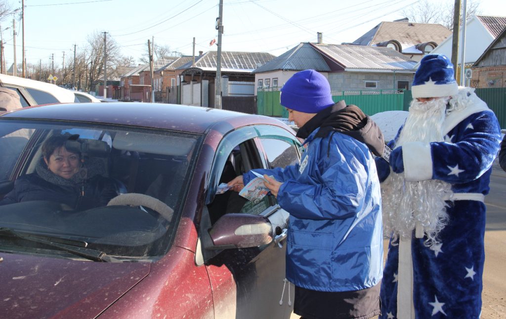 Дорога превратилась в яркую новогоднюю сказку, в которой главными героями стали Дед Мороз, Снегурочка и ЮИДовцы отряда «Автостоп» МБОУ Матвеево-Курганской сош № 1.