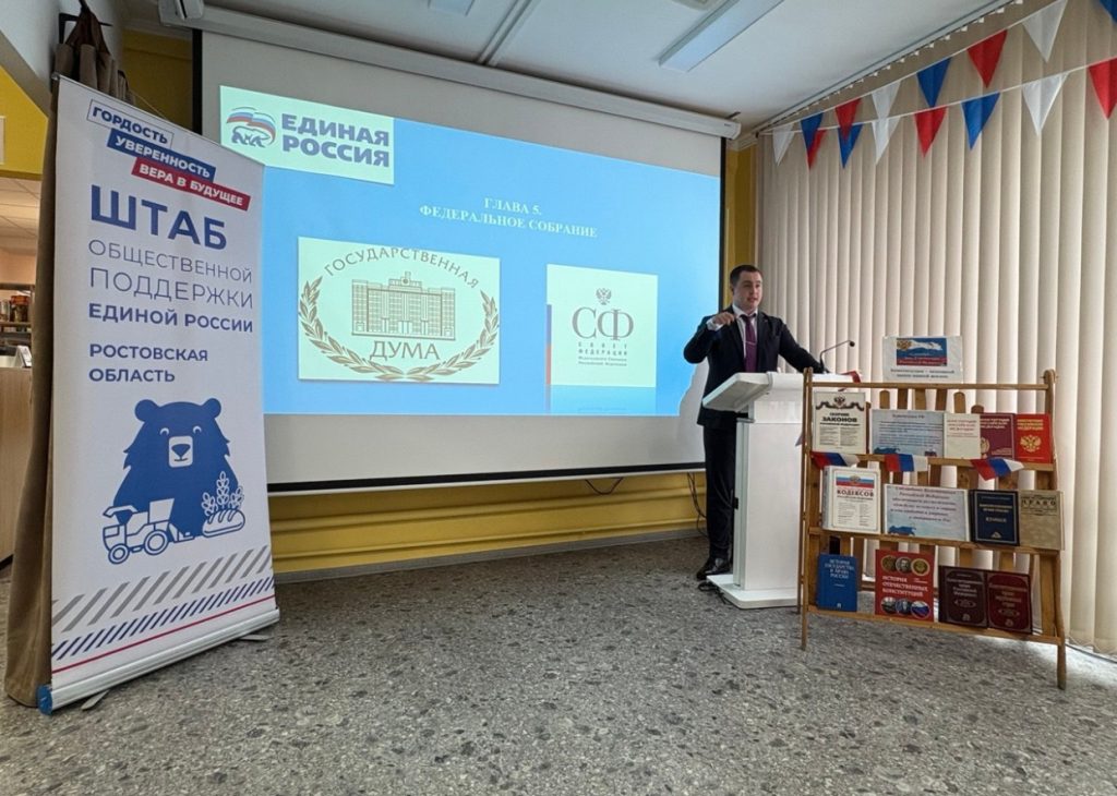 В преддверии празднования Дня Конституции РФ в межпоселенческой библиотеке поселка Матвеев Курган при содействии Штаба общественной поддержки в Ростовской области прошла правовая лекция для учащихся старших классов Матвеево-Курганской средней школы №1. Активист местного отделения Партии Семен Бутенко рассказал ребятам о первых проектах Конституции в России, о принятии на всеобщем референдуме Конституции РФ, о структуре закона, полномочиях Президента, Государственной Думы, Совета Федерации, о судебной власти в России и т.д. Лекция сопровождалась презентацией на тему «Конституция – основной закон государства». Учащиеся проявили живой интерес к теме. Задавали вопросы и делились своими мыслями о Конституционных нормах.