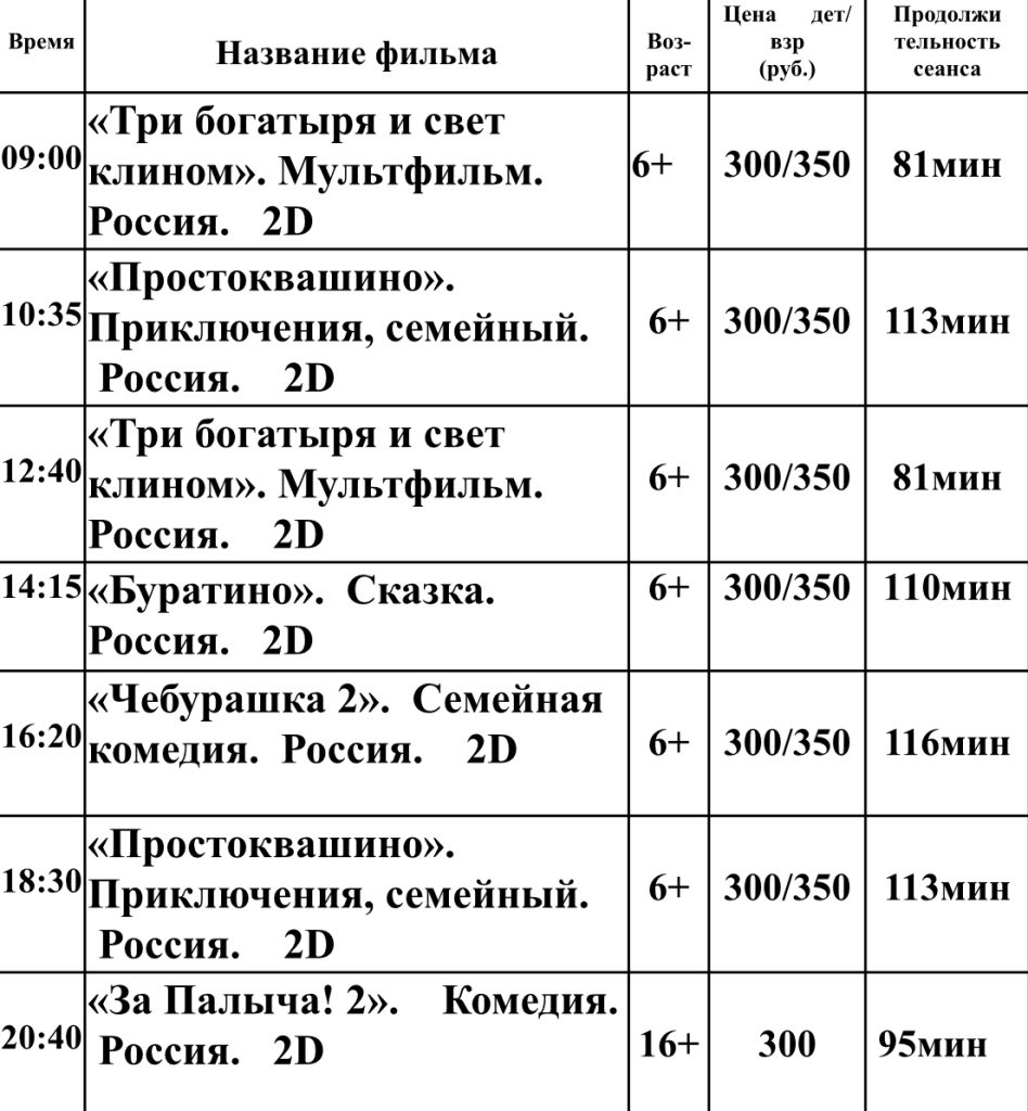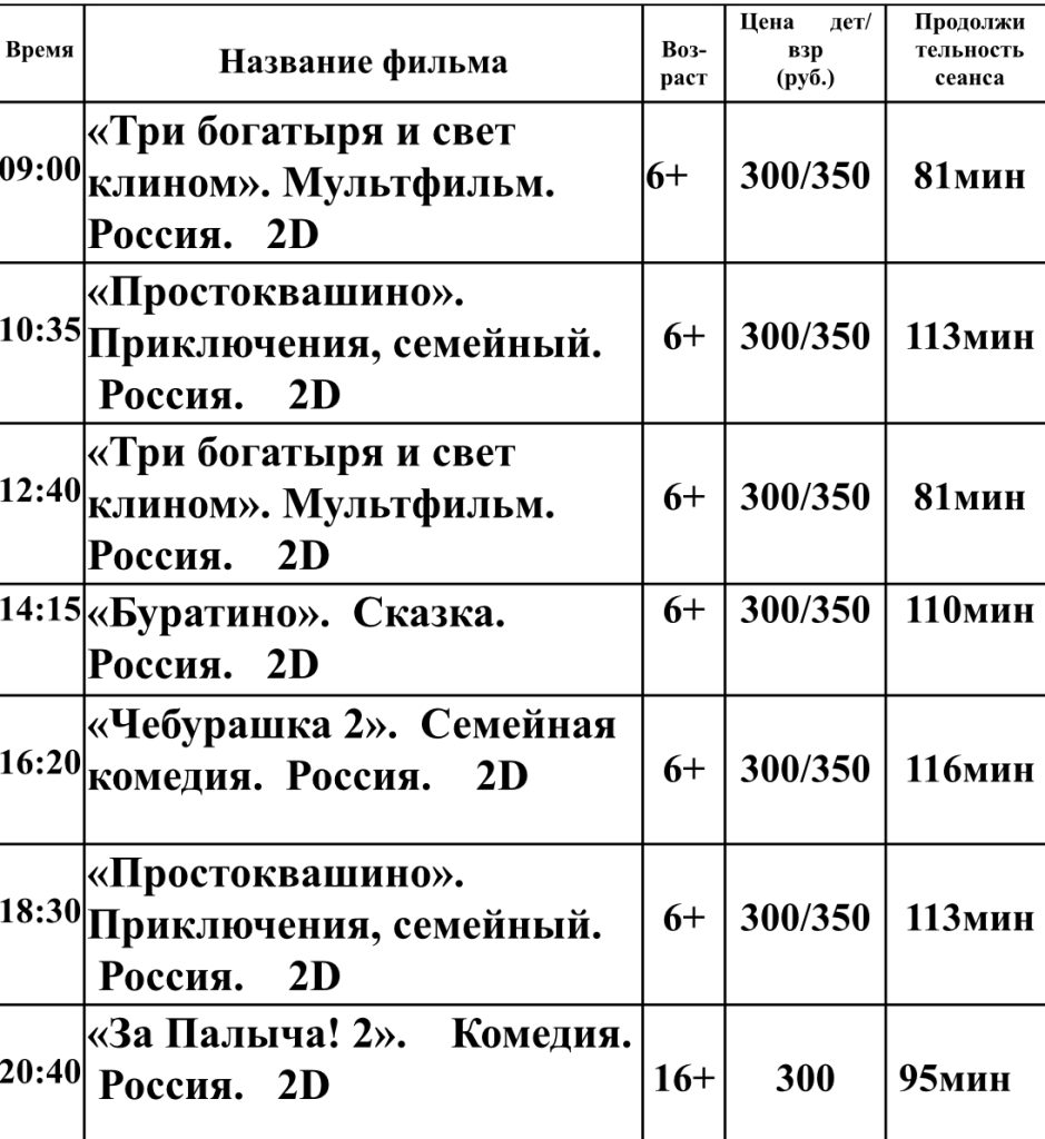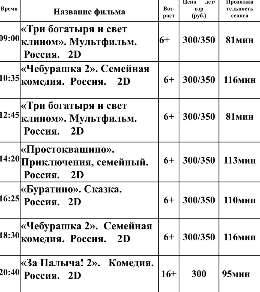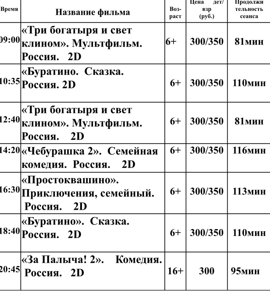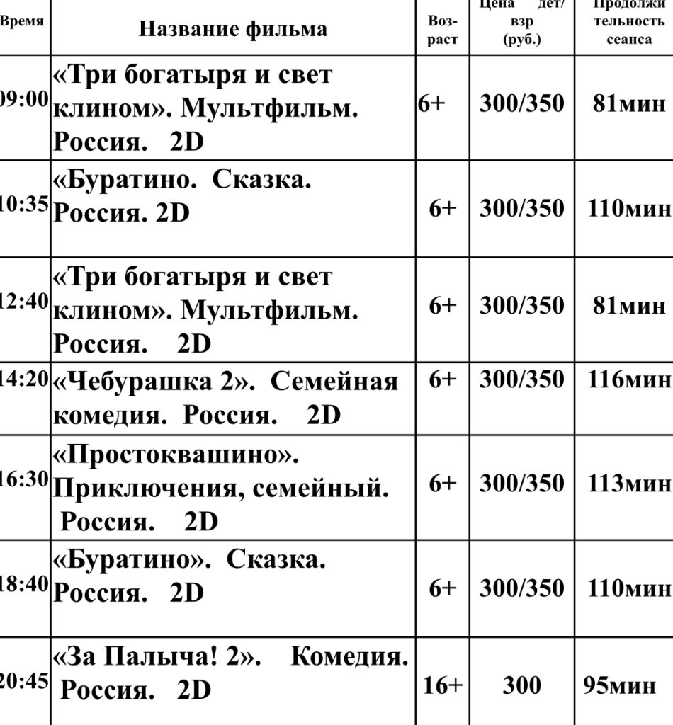 Обращаем ваше внимание что расписание каждый день разное! Будьте внимательны. Перед посещение кинотеатра бронируйте билеты заранее. Бронь снимается за 15 мин до начала сеанса. Если вы задерживаетесь, то позвоните, пожалуйста, по номеру телефона 8 900 136 51 04.
