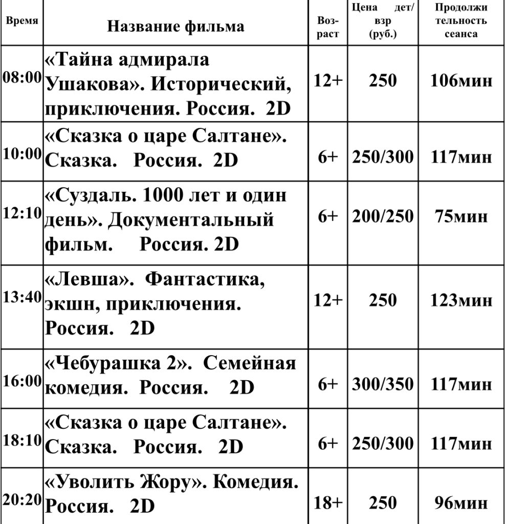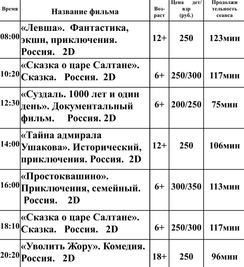 Главная » Афиша Репертуарный план кинотеатра «Октябрь» с 12 по 18 февраля Афиша На чтение 1 мин Опубликовано 14.02.2026 п. Матвеев Курган ул. 1-ая Пятилетка №105 Телефон – 8 900-136-51 04 Понедельник и вторник — выходные дни 12.02, 14.02, 18.02 13.02, 15.02