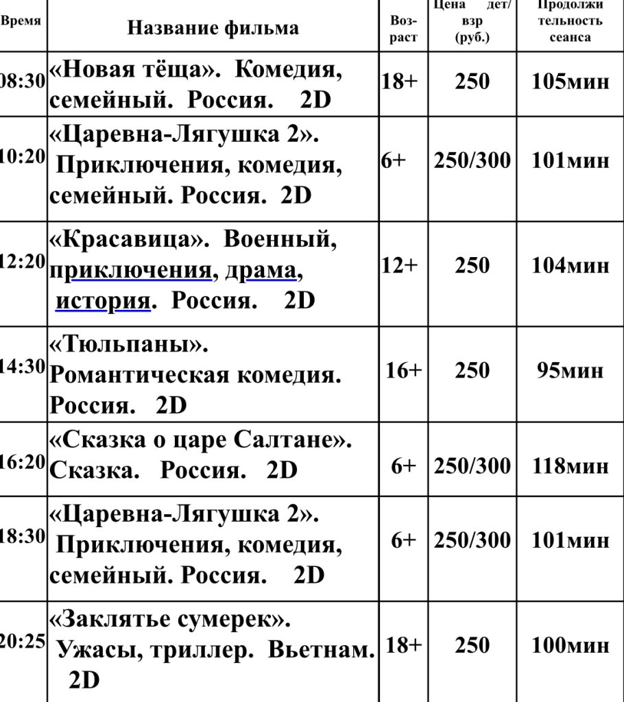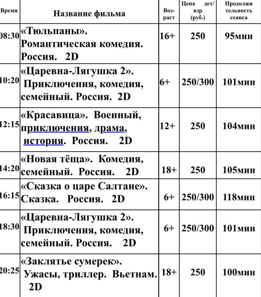 Главная » Афиша Репертуарный план кинотеатра «Октябрь» с 12 по 18 марта Афиша На чтение 1 мин Опубликовано 12.03.2026 п. Матвеев Курган ул. 1-ая Пятилетка №105 Телефон – 8 900-136-51 04 Выходные дни –понедельник, вторник 12.03,13.03,18.03 14.03,15.03