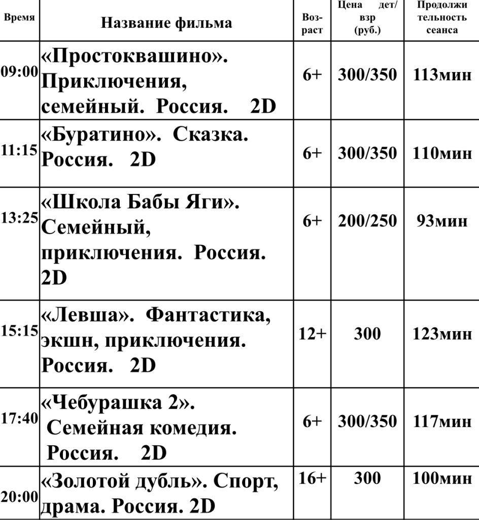 Главная » Афиша Репертуарный план кинотеатра «Октябрь» с 29 января по 4 февраля Афиша На чтение 1 мин Опубликовано 30.01.2026 п. Матвеев Курган ул. 1-ая Пятилетка №105 Телефон – 8 900-136-51 04 Понедельник и вторник — выходные дни