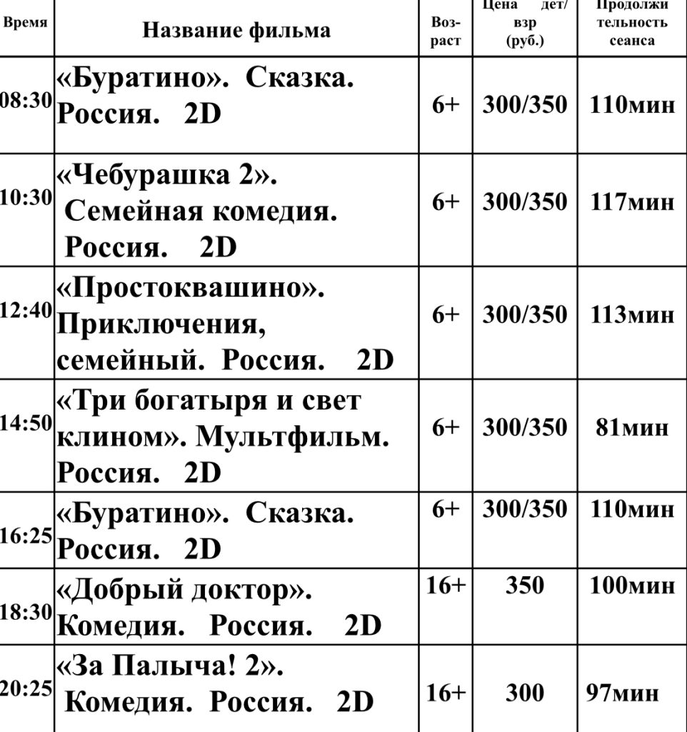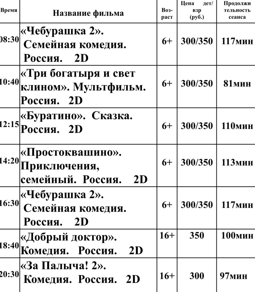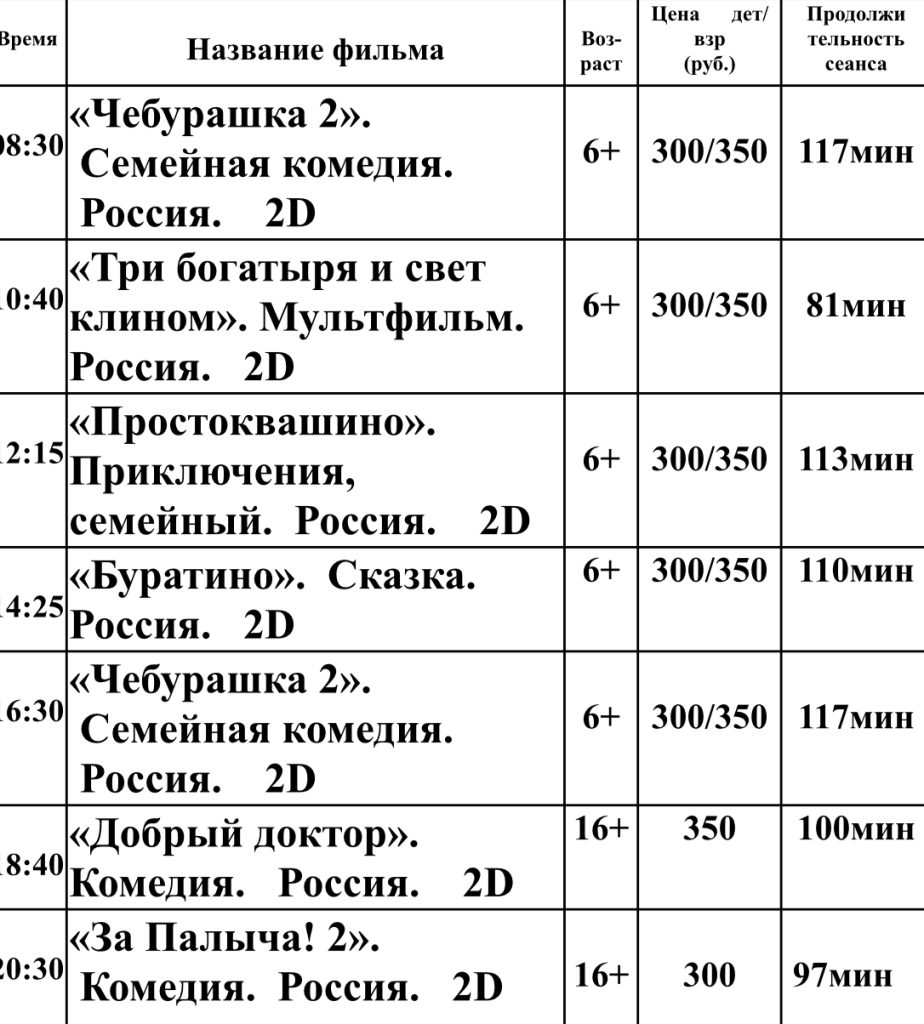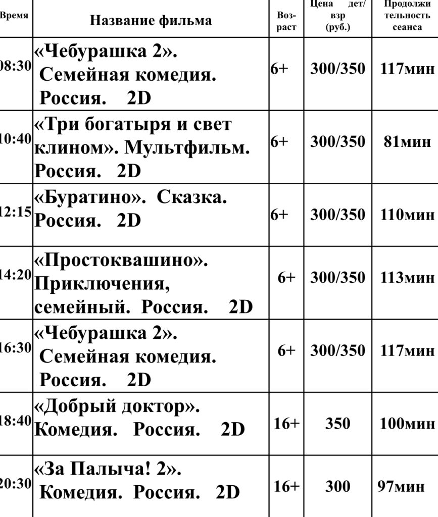 Главная » Афиша Репертуарный план кинотеатра «Октябрь» с 8 по 14 января Афиша На чтение 1 мин Опубликовано 08.01.2026 п. Матвеев Курган ул. 1-ая Пятилетка №105 Телефон – 8 900-136-51 04 Понедельник и вторник — выходные дни. 08.12 09.12 10.12 11.12 14.12