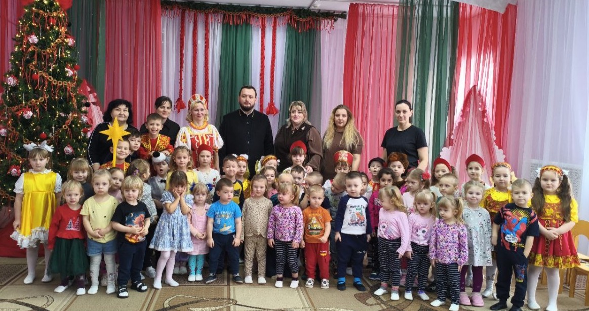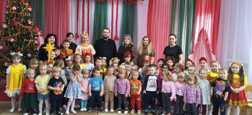 Воспитанники разновозрастной подготовительной к школе старшей группы пели колядки, участвовали в театрализации, играли с малышами и сотрудниками в веселые игры.
