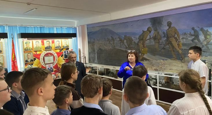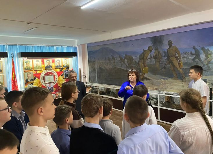 Начали свою экскурсию по музею с зала Боевой Славы, где директор музея Дианова Наталья Евгеньевна познакомила посетителей музея с основными событиями Миус-фронта и экспонатами, связанными с событиями 1941-1943 годов на территории нашего района.