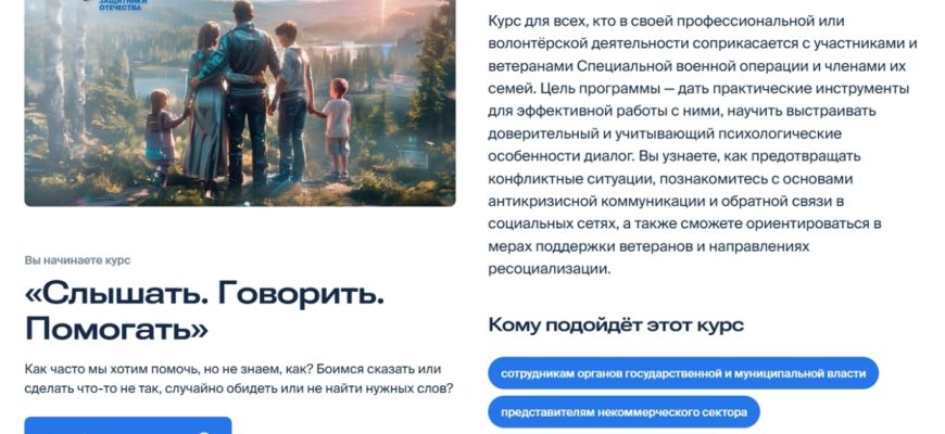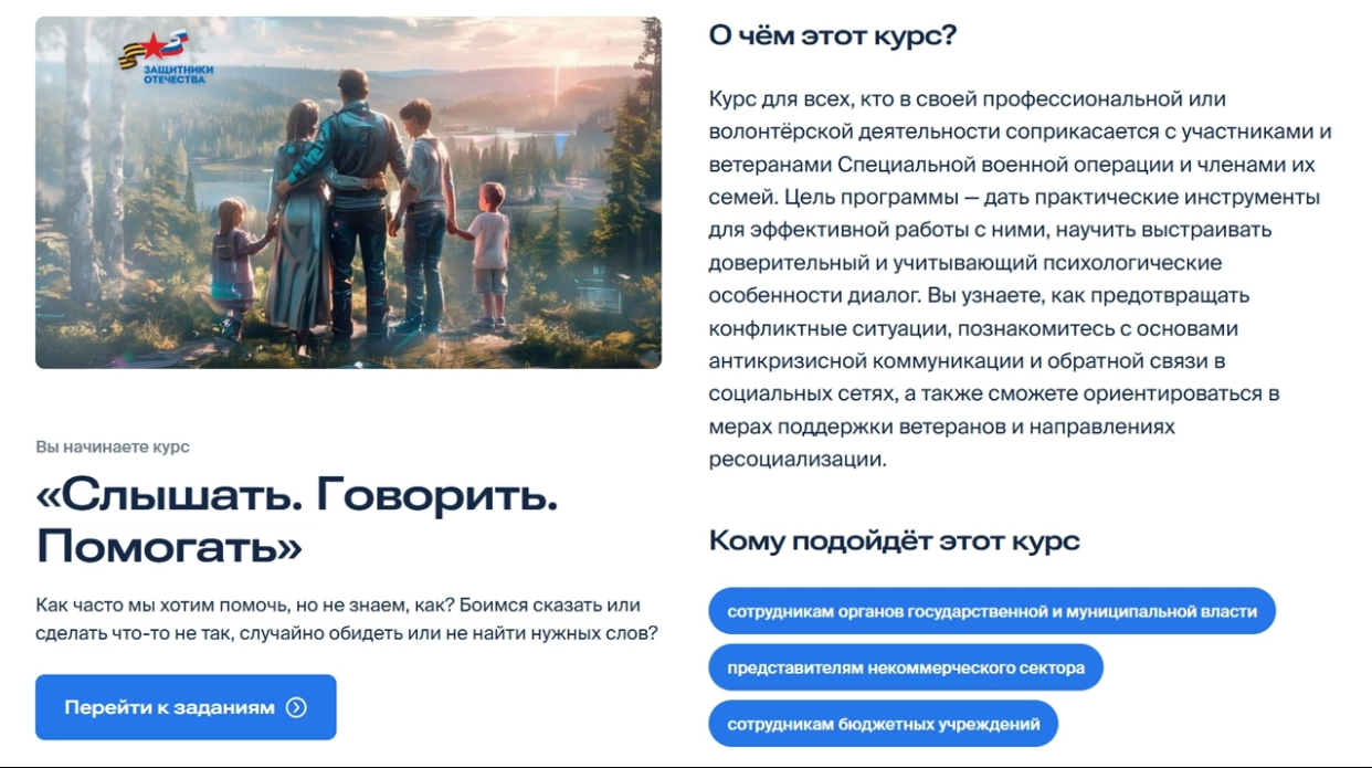 Ключевая цель курса — систематизировать знания и дать практические инструменты для комплексной поддержки защитников и их близких. Среди основных тем: особенности взаимодействия с участниками СВО и членами их семей, помощь в получении мер поддержки, работа с информационными рисками, противодействие фейкам, реагирование на сложные запросы, разрешение конфликтных ситуаций.