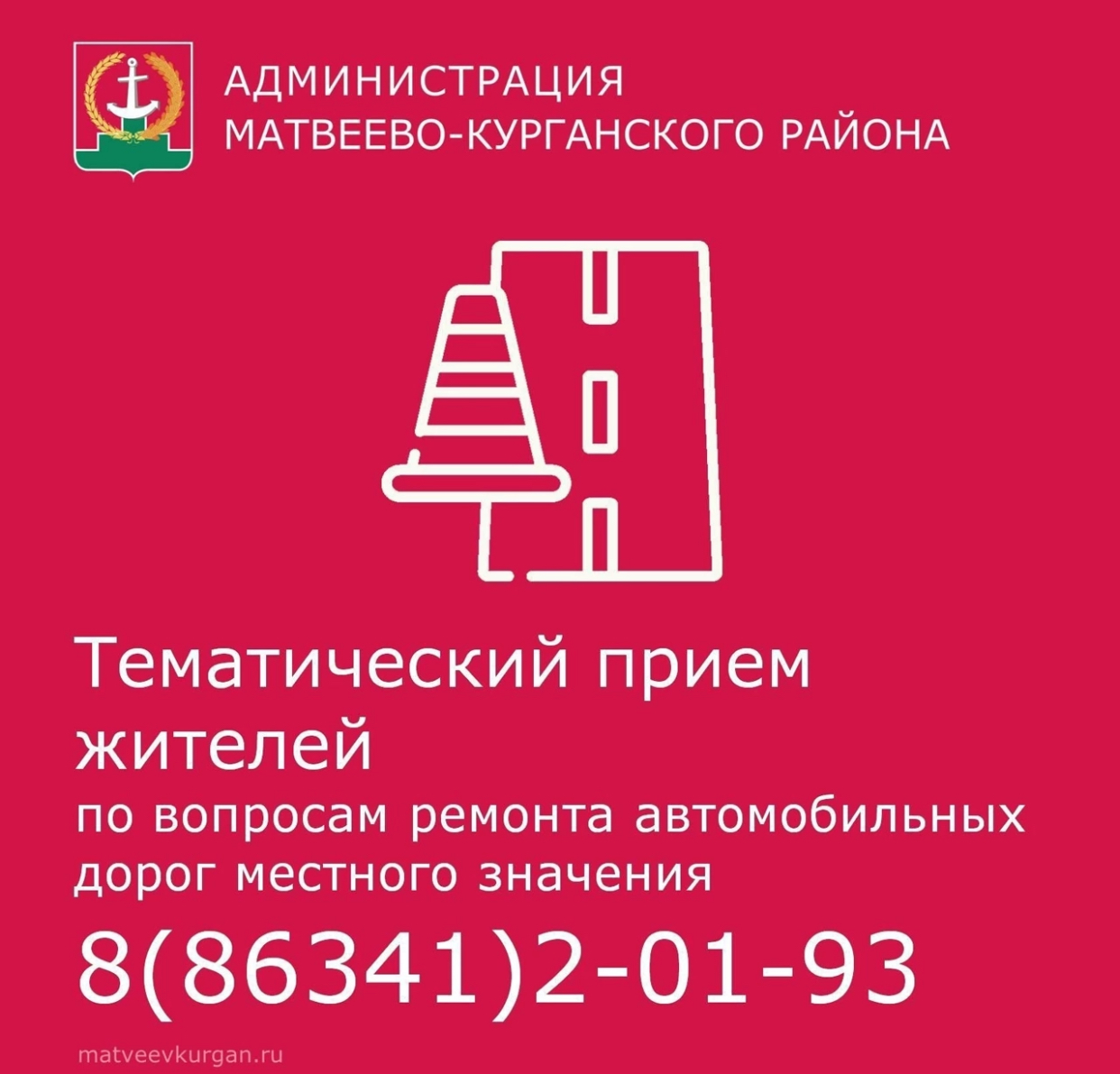 25 декабря 2025 года в 9-00 в общественной приёмной губернатора Ростовской области состоится тематический приём граждан главой Администрации Матвеево-Курганского района Диной Алборовой по вопросам ремонта автомобильных дорог местного значения.